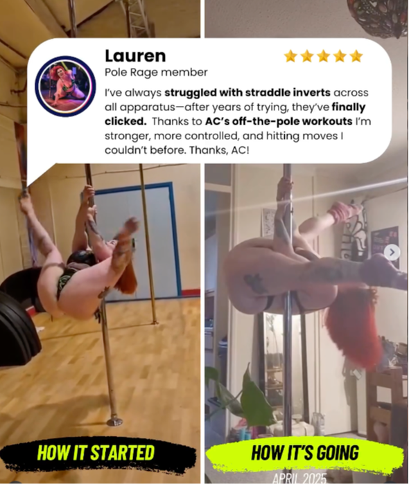 This is structured cross-training for pole — designed to build the real strength, control, and mobility your tricks require.